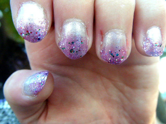 I didnt want to get to crazy because we litterally did these like, an hour before the concert, OUTSIDE the venue.. if u dont believe me.. well... look at the picture.. you can see the sign. So you HAVE to believe me. :) I started with a base coat of a shimmery translucent color... (sorry i dont have the names, like I said, it wasnt my polish) and after we let that dry for like 2.5 seconds I used a sparkly purple to do a gradient so that it would match her eye make up and shirt. After that I added just a touch of WnW Party of 5 Glitters (i know this name because I have like 6 bottles LOL) to each nail and to give it a little UMPH..